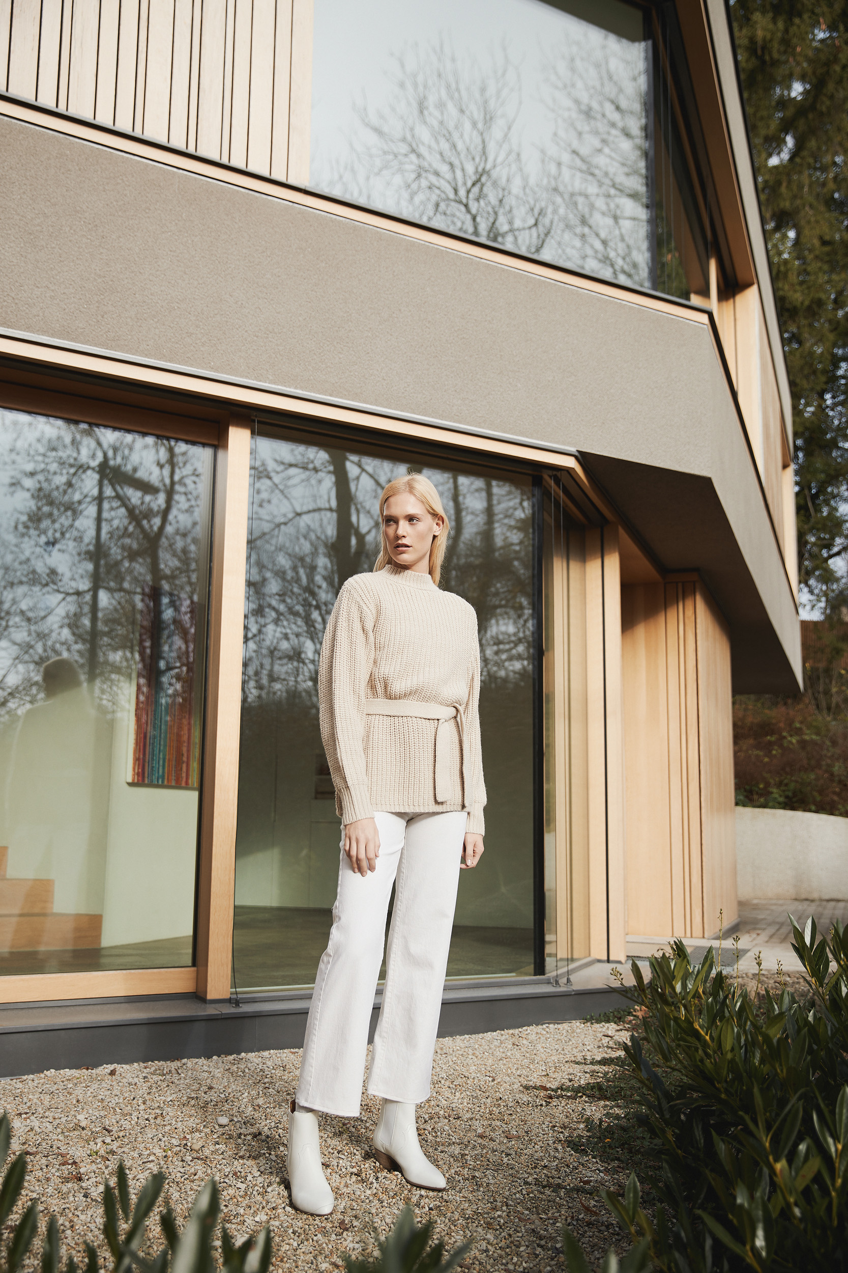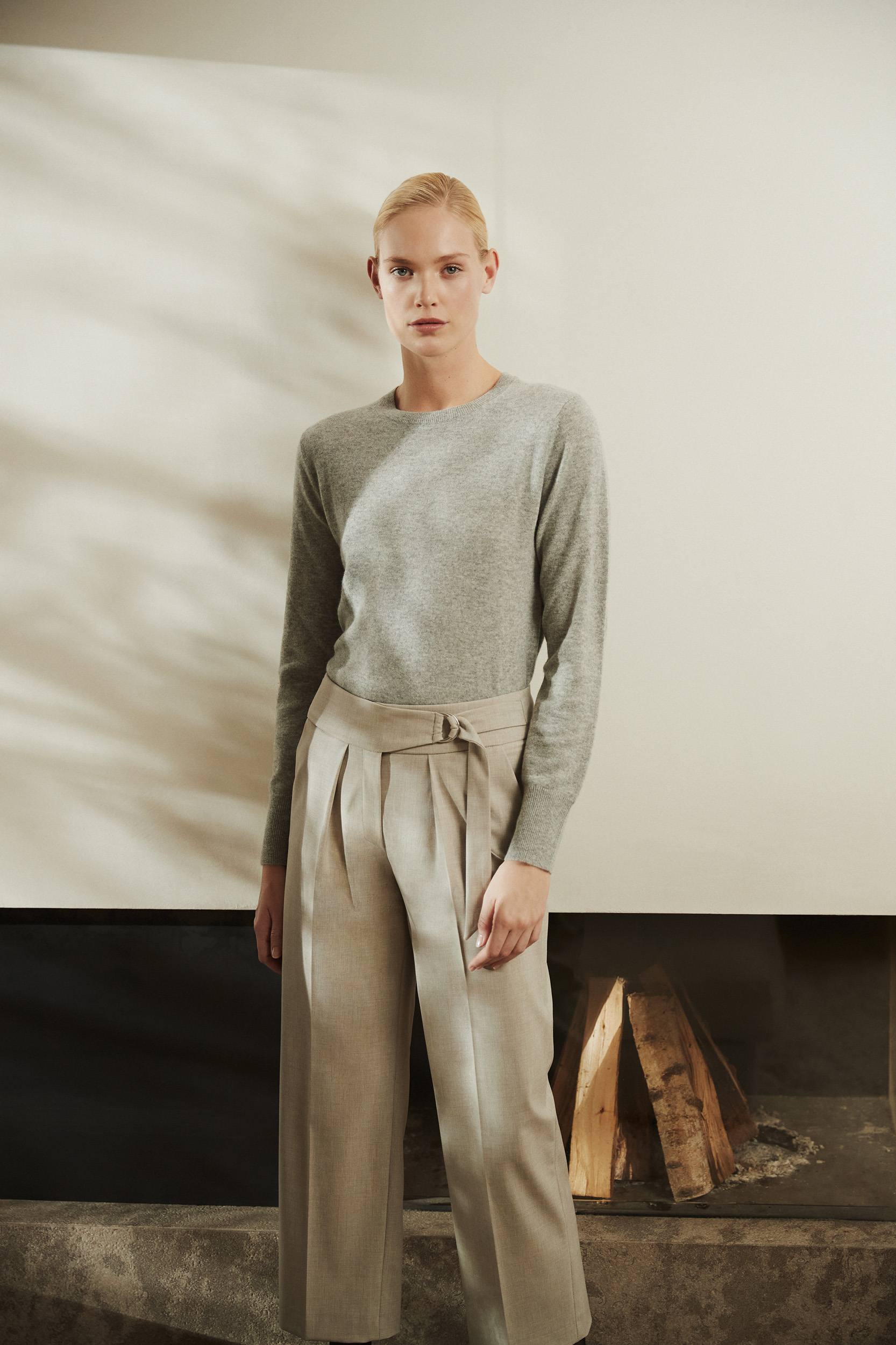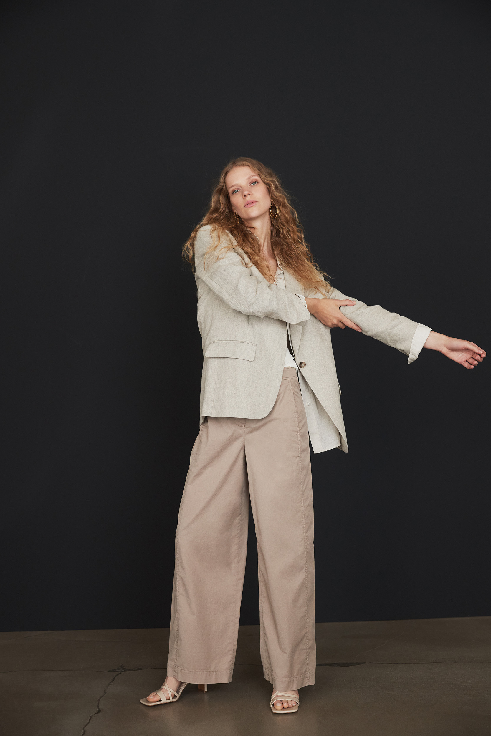 • Wählen Sie eine beige Hose mit einem fließenden Stoff, der Ihre Silhouette sanft umspielt.